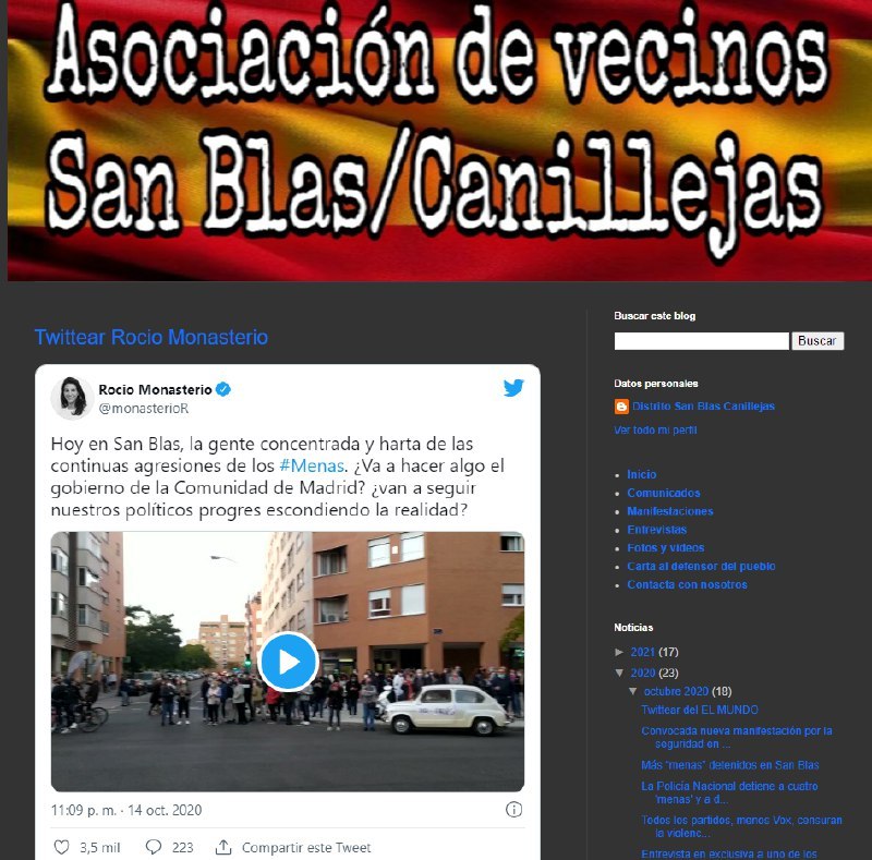 Al examinar las redes de Armando Rodríguez encontramos que Santiago Abascal es el político al que más retuitea, junto a otras iniciativas aplaudidas por Vox como ‘España Resiste’, movimiento al que pertenece. Por otro lado; analizando las cuentas de ‘AAVV Pinar de Chamartín y Hortaleza Carlomagno’, principal promotora de ‘Madrid Seguro’, observamos que inicia su actividad en Instagram cuando se suma a las manifestaciones convocadas por VOX para exigir la dimisión de Pedro Sánchez haciendo mención directa a la cuenta de Abascal.