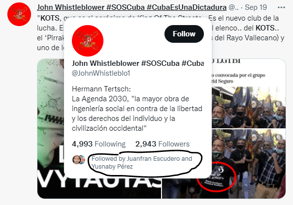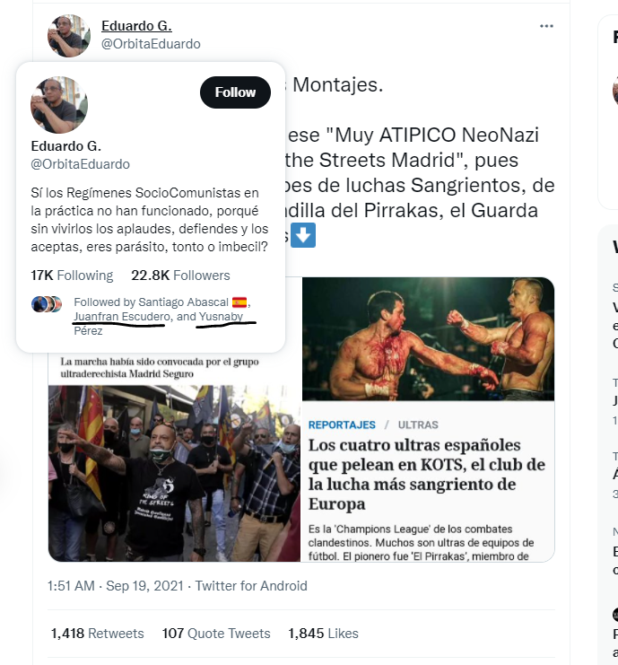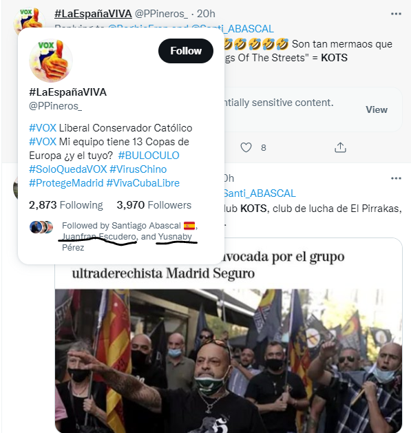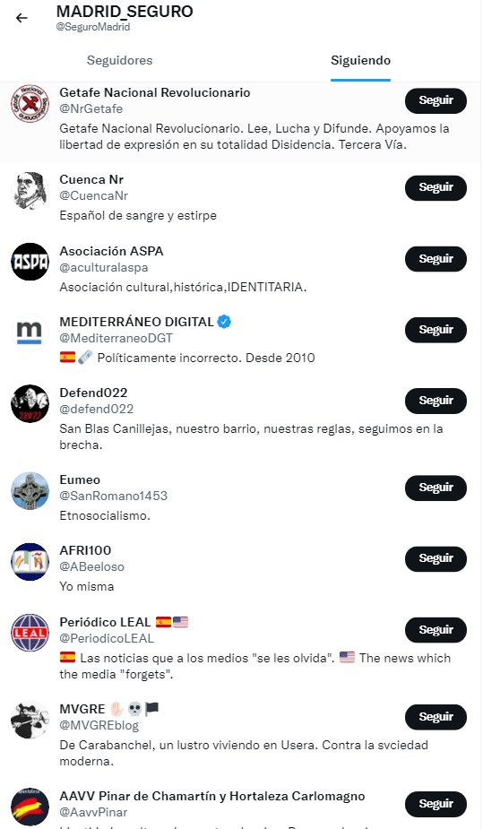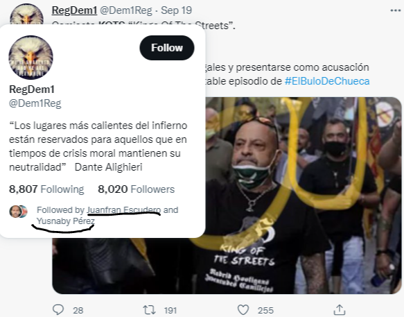 Al mirar entre los seguidos y seguidores de su cuenta oficial de Twitter observamos que entre las once cuentas a las que siguen se encuentran los anteriormente mencionados digitales ‘Periódico Leal’ y ‘Mediterráneo Digital’ o dos de las “asociaciones de vecinos” que componen la “federación” ‘AAVV Pinar de Chamartín, Hortaleza Carlomagno’ y ‘Getafe Nacional Revolucionario’. Entre las primeras cuentas en seguir a esta organización que convocó la manifestación encontramos a quien parece ser su portavoz, Armando Rodríguez, y cuentas oficiales de Vox y España 2000.