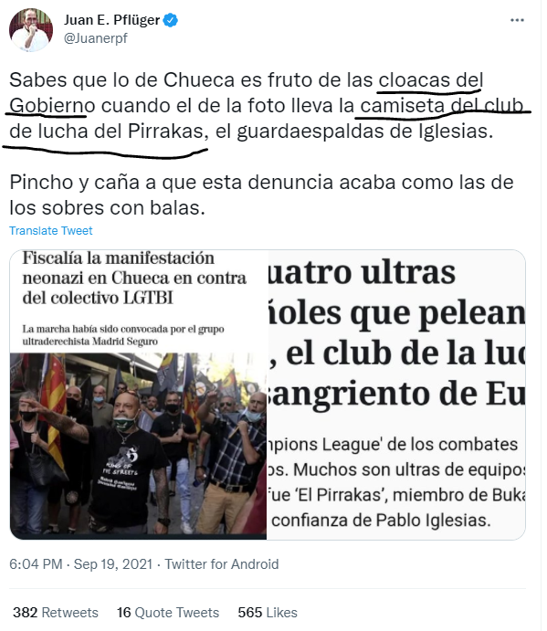 Al tweet y las declaraciones de Santiago Abascal sobre la ‘conspiración socialista’ se han sumado otros habituales de los bulos y noticias falsas. Es el caso del omnipresente Alvise Pérez, que afirmaba “Apesta a montaje”. Más lejos ha ido Juan Pflüger -responsable nacional de prensa de VOX-, que afirma sobre una fotografía con poca resolución que uno de los asistentes a la manifestación llevaba una camiseta que él vincula con el guardaespaldas de Pablo Iglesias. Cuando acudimos a la fotografía original podemos leer nítidamente “Madrid Hooligans. Juventudes Canillejas”, un conocido grupo ultraderechista.