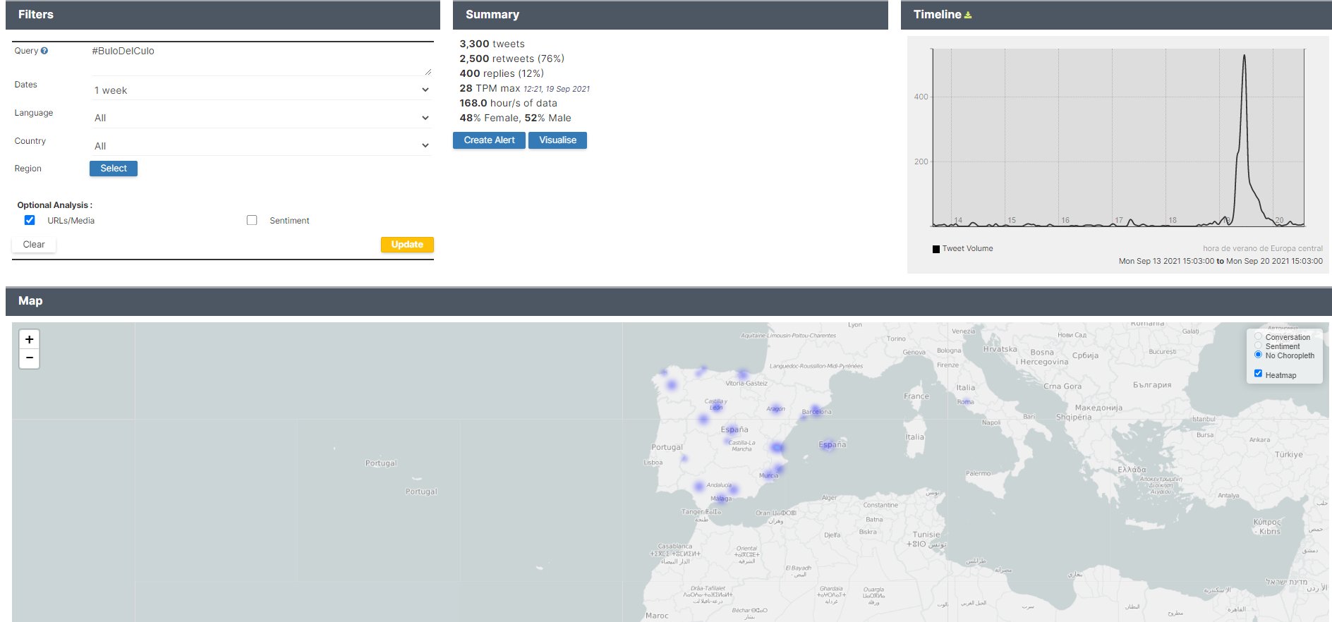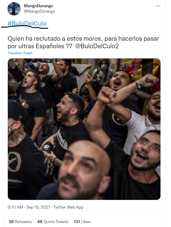Al revisar cómo se ha comportado la difusión de este nuevo bulo observamos que generó un pico de 3.300 tweets en el ya estudiado HT #ElBuloDelCulo durante el día posterior a la manifestación; pues no en pocos tweets se relacionaban ambos casos. En estos mensajes se agregaba al supuesto fraude de la camiseta que los manifestantes parecían marroquíes, lo cual no deja de resultar paradójico teniendo en cuenta que uno de los lemas coreados en la manifestación fue “no eres español porque no eres blanco”.