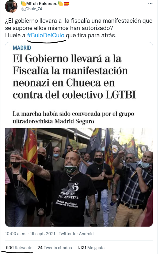 Esta manifestación en la que llevaban pancartas contra los MENAs y Bandas Latinas, tienen lugar sólo una semana después de que desde el entorno de VOX se difundiera que detrás de la agresión homófoba de Malasaña había una banda latina y que tras conocerse que dicha agresión había sido denunciada en falso esas mismas cuentas viralizaran el hashtag #elbulodelculo; tal y como ya contamos la pasada semana en Pandemia Digital.