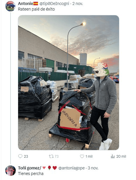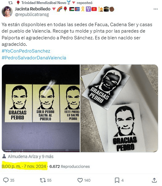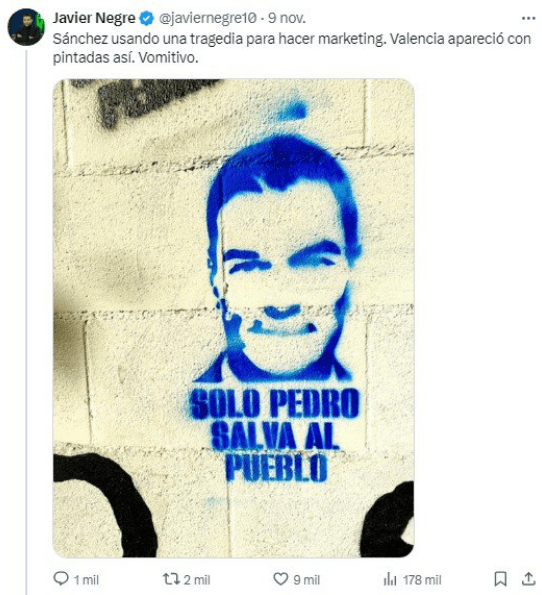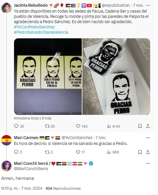 Tras esta primera publicación con las plantillas el pasado 7 de noviembre la siguiente que encontramos es de un día después de otra cuenta perteneciente a este mismo trollcenter –@trinidadMNovo– y publica una fotografía editada de una pared con uno de estos grafitis, tal y como ha podido confirmar Newtral. Y no es la única. En otra de las imágenes falsas publicadas por esta cuenta que simula ser “Experta en identidad de género, corponormatividad e identidad racial” señala directamente a Cruz Roja como autores de estos grafitis. Cabe destacar que desde los primeros días de la catástrofe de Valencia la ultraderecha ha emprendido una campaña de acoso y difamación contra Cruz Roja, en cuyo transfondo se encuentra la labor de la entidad en la atención humanitaria de las personas migrantes. En otra de las imágenes manipuladas, que Newtral ha podido contrastar también, se simula uno de estos grafitis sobre otro hecho con barro en el que da las gracias a los voluntarios que están colaborando en las labores de limpieza de los municipios afectados.