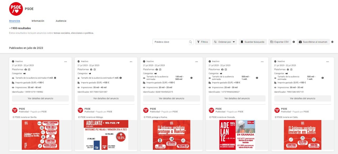 En su campaña en Facebook encontramos que han lanzado un gran número de publicaciones segmentadas territorialmente, lo cual es un acierto en este tipo de campañas, pero al igual que en el caso del PP y de Sumar las ventanas de promoción eran de apenas un día, por lo cual el coste por impresión se dispara y reduce su eficacia.